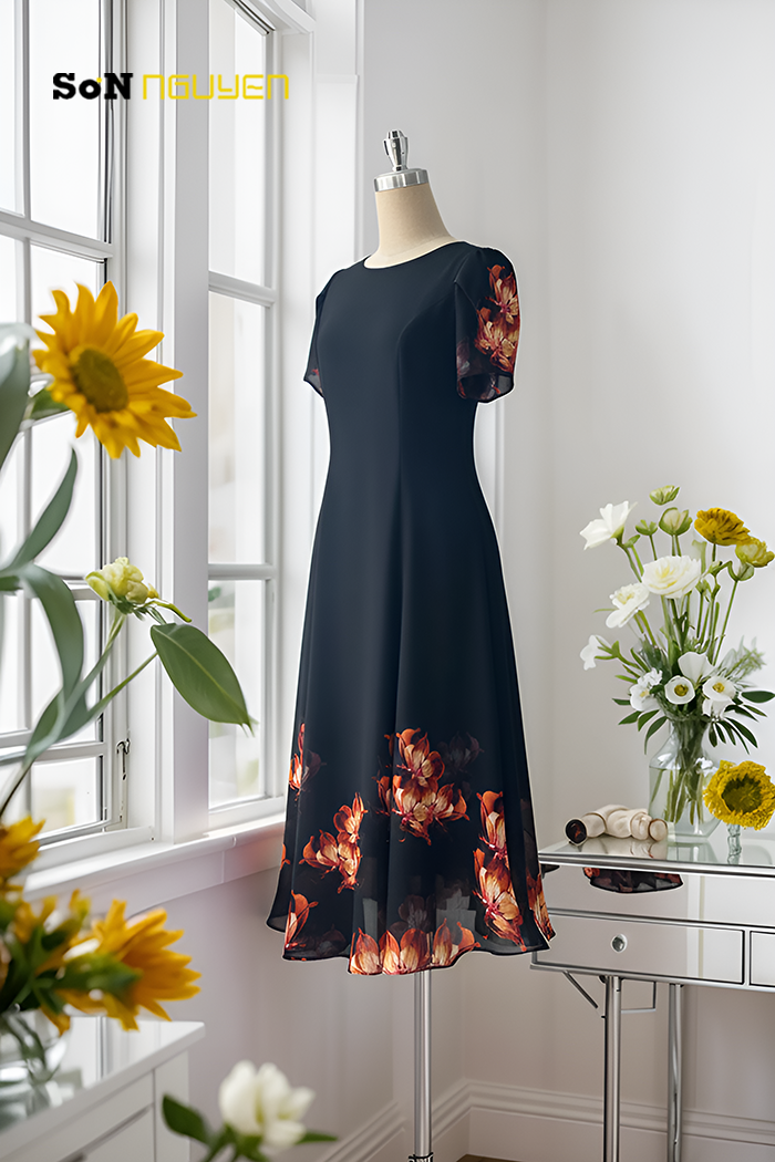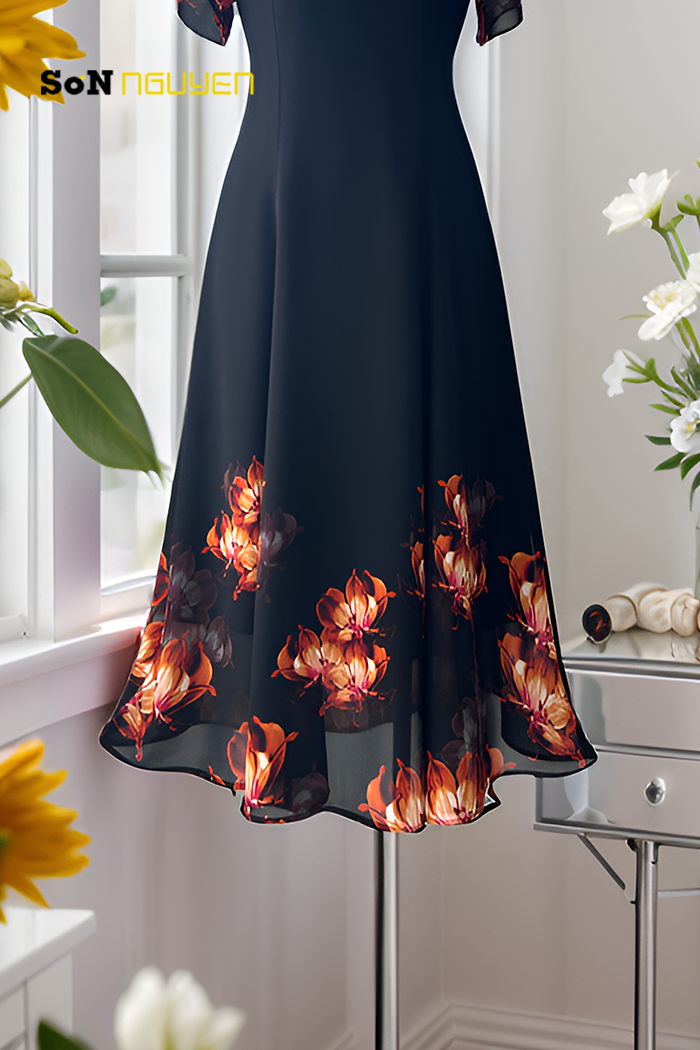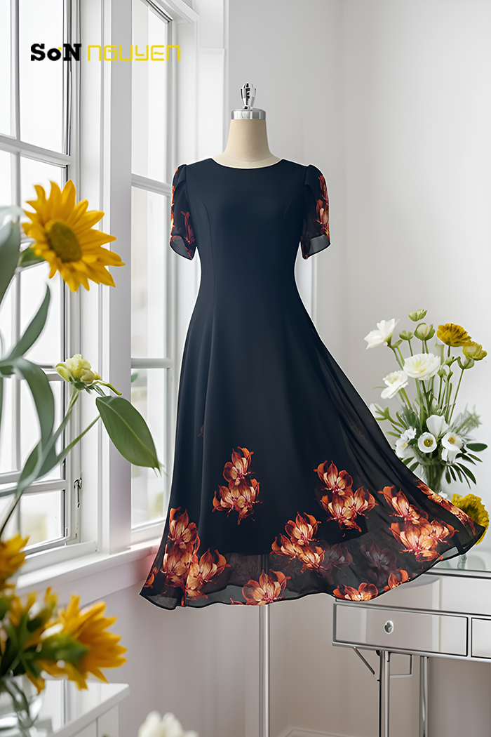 - Đầm hoa trung niên 8 mảnh eo suông giấu bụng 37801