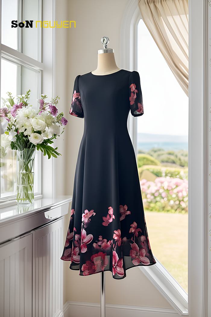 Đầm hoa trung niên với thiết kế 8 mảnh tạo ra những đường cắt cúp làm nổi bật vẻ nữ tính và duyên dáng của người mặc. Các mảnh vải được ghép lại khéo léo để tạo ra hình dạng và vẻ đẹp tổng thể cho váy. Thiết kế 8 mảnh giúp che đi những khuyết điểm về hình dáng cơ thể, như bụng to hay hông rộng của phụ nữ tuổi trung niên.