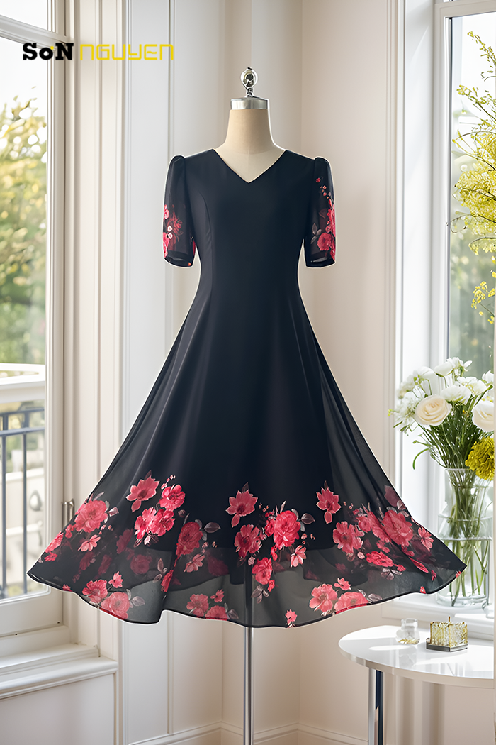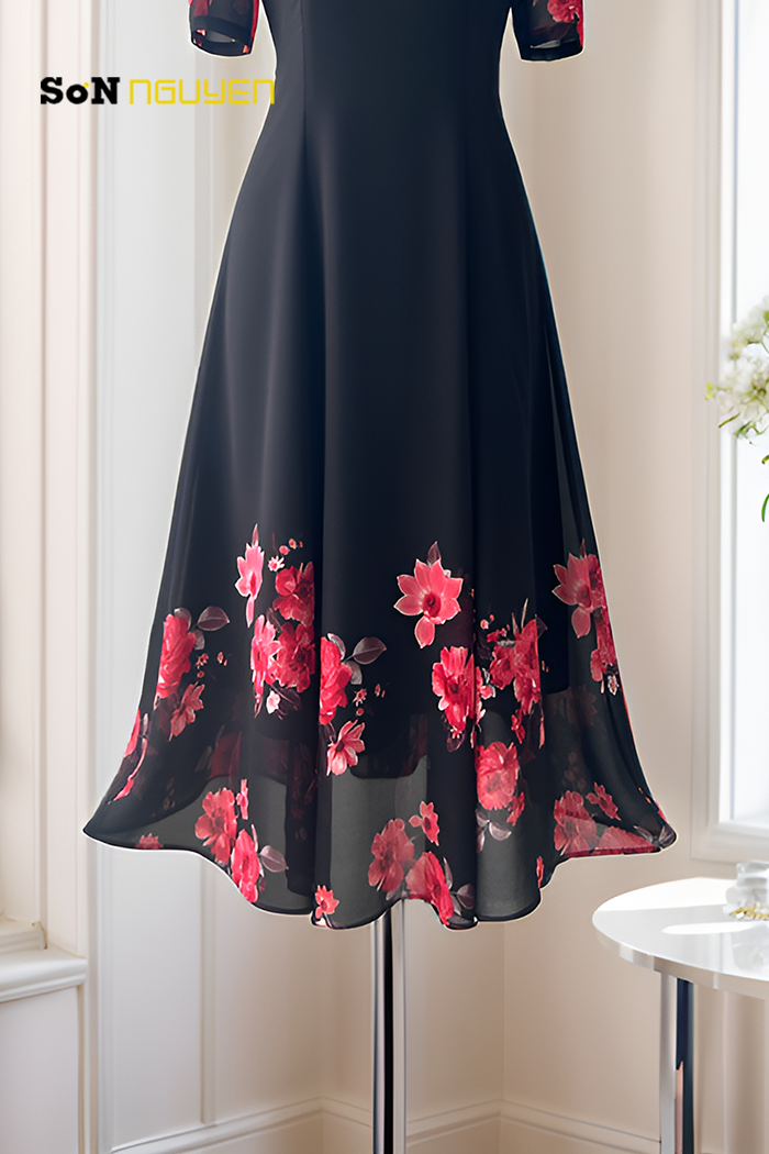 Đầm hoa trung niên với thiết kế 8 mảnh tạo ra những đường cắt cúp làm nổi bật vẻ nữ tính và duyên dáng của người mặc. Các mảnh vải được ghép lại khéo léo để tạo ra hình dạng và vẻ đẹp tổng thể cho váy. Thiết kế 8 mảnh giúp che đi những khuyết điểm về hình dáng cơ thể, như bụng to hay hông rộng của phụ nữ tuổi trung niên.