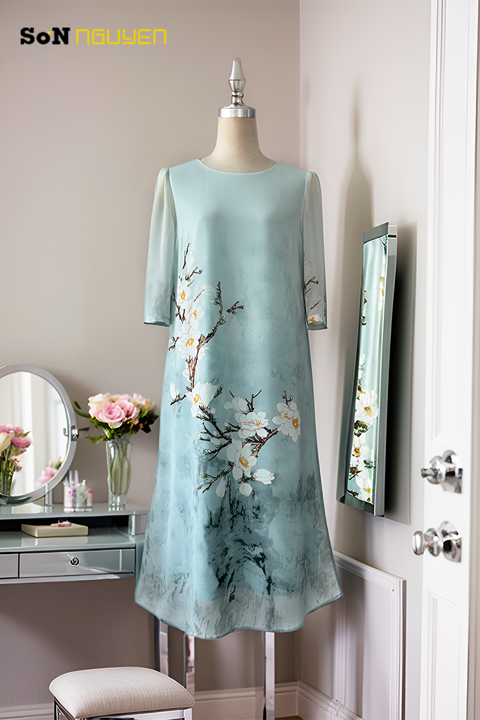 Chiếc đầm suông với gam màu xanh ngọc nhẹ nhàng mang đến vẻ đẹp thanh thoát và sang trọng, thiết kế tối giản nhưng đầy tinh tế. Họa tiết hoa mai in ở phần thân váy tạo nên điểm nhấn nổi bật, thu hút ánh nhìn. Với kiểu dáng suông vừa phải, chiếc đầm giúp che đi khuyết điểm ở phần bụng và hông to, mang lại cảm giác thon gọn và tự tin cho người mặc. Chất liệu voan 2 lớp mềm mại tạo sự thoải mái tối đa, phù hợp cho nhiều dịp như đi làm, dự tiệc hoặc dạo phố. Tay áo lửng nhẹ nhàng lịch sự. Đây là lựa chọn hoàn hảo cho những quý cô trung niên yêu thích phong cách thời trang thanh lịch và duyên dáng nhưng vẫn đảm bảo sự thoải mái và tự tin trong từng chuyển động.
