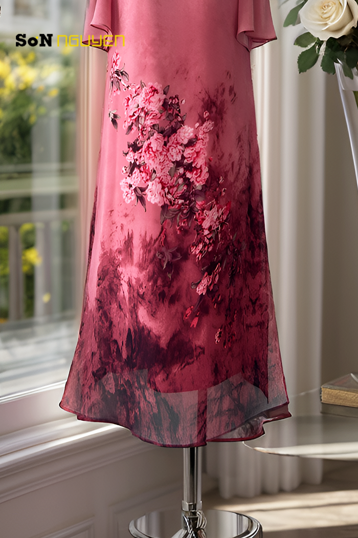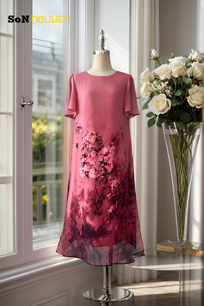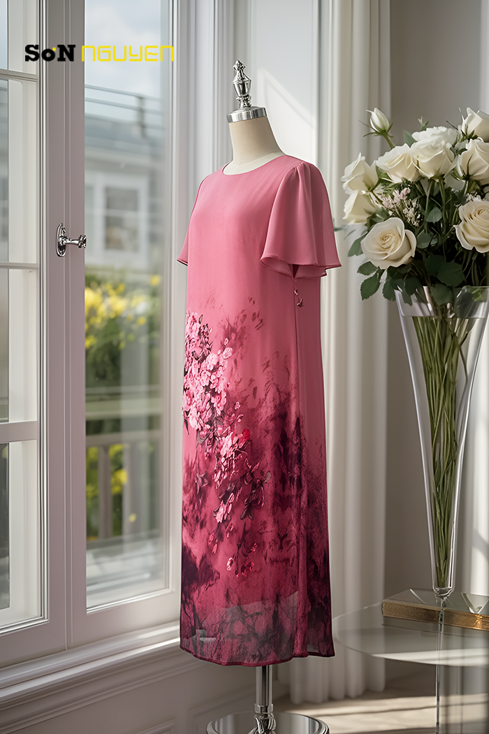 Chiếc đầm suông trung niên màu hồng mang đến vẻ đẹp quyến rũ và sang trọng với họa tiết hoa tinh tế. Thiết kế rộng rãi với dáng suông giúp che đi khuyết điểm ở phần bụng và hông, tạo cảm giác thon gọn, tự tin cho người mặc. Chất liệu vải mềm mại cùng phần tay áo loe nhẹ làm tăng thêm sự thoải mái, phù hợp cho nhiều dịp khác nhau như dạo phố hay dự tiệc. Họa tiết hoa nhẹ nhàng ở phần thân váy kết hợp với màu sắc hài hòa tạo nên điểm nhấn đầy cuốn hút. Đây là mẫu trang phục lý tưởng cho các quý cô yêu thích sự đơn giản, thanh lịch nhưng vẫn giữ được nét duyên dáng và hiện đại trong phong cách thời trang