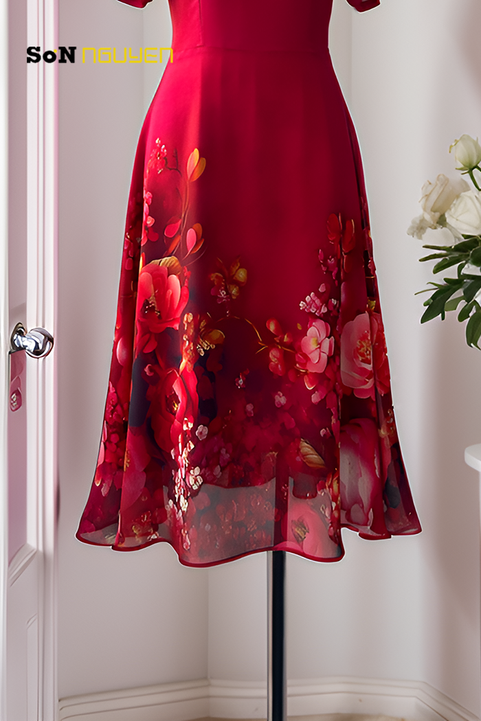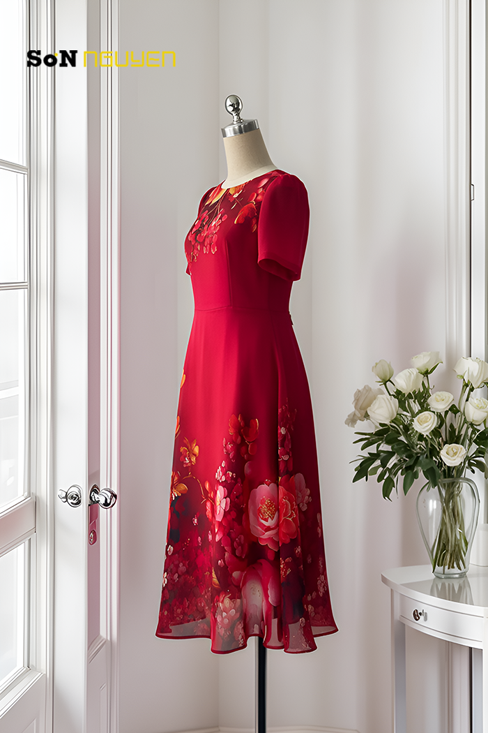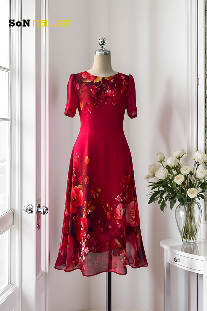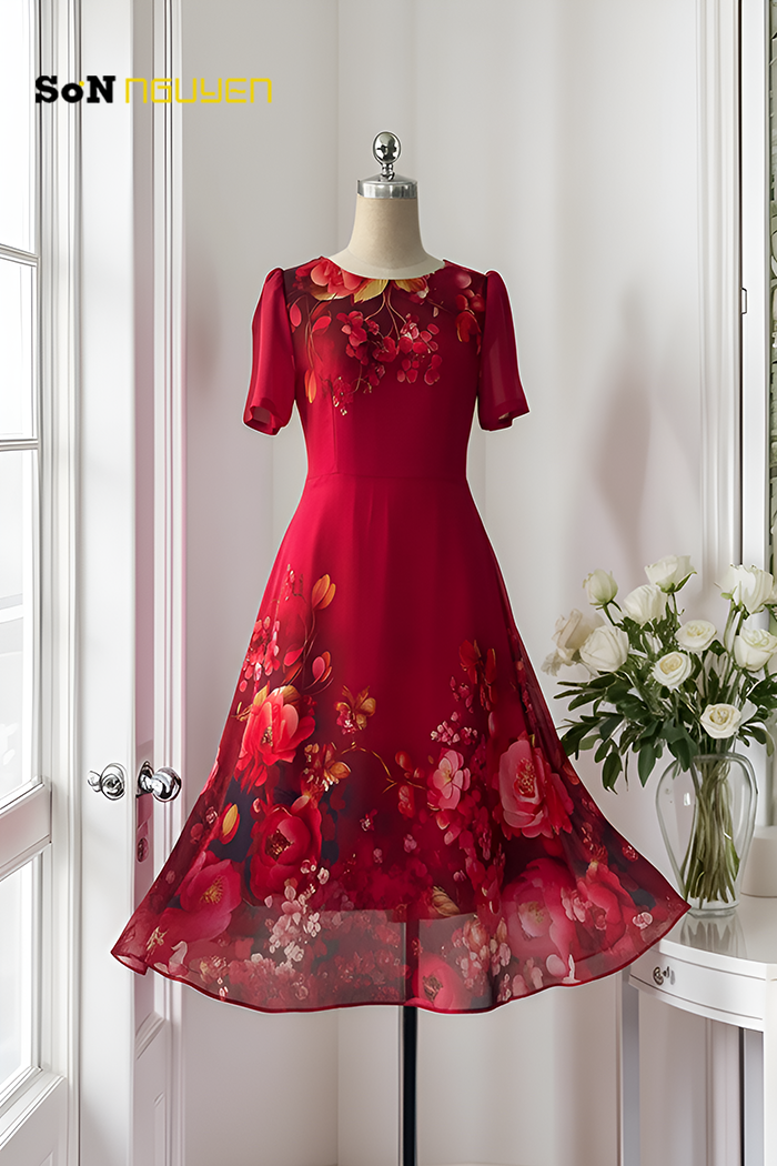 Chiếc đầm xoè hoa dành cho phụ nữ trung niên nổi bật với tông đỏ rực rỡ kết hợp họa tiết hoa tinh tế mang lại vẻ đẹp sang trọng và cuốn hút. Thiết kế cổ tròn, tay ngắn phồng nhẹ phù hợp với nhiều vóc dáng. Chất liệu voan cao cấp 2 lớp mềm mại, tạo độ bay nhẹ nhàng khi di chuyển, đồng thời ít nhăn giúp phái đẹp luôn giữ được vẻ chỉnh chu suốt cả ngày. Phần thân trên ôm vừa phải, kết hợp phần váy xoè nhẹ giúp che đi khuyết điểm vùng bụng hay hông, tạo hiệu ứng thon gọn hiệu quả. Đây là lựa chọn lý tưởng cho các dịp lễ, tiệc hay dạo phố. Mẫu đầm không chỉ mang đến sự thoải mái mà còn tôn lên nét thanh lịch, quý phái cho người mặc.