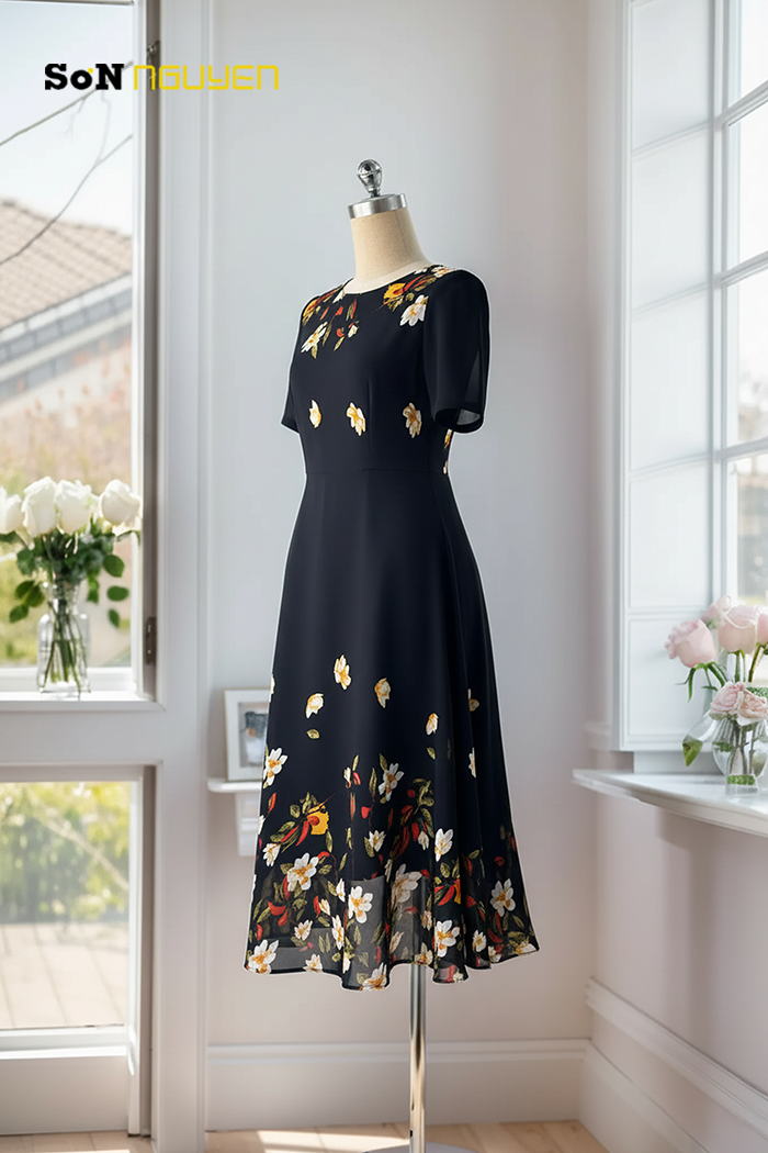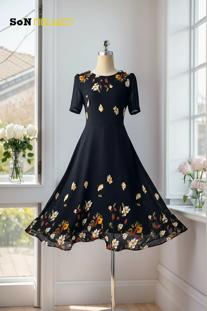 Thiết kế đầm xòe dành riêng cho phụ nữ trung niên, tôn lên nét thanh lịch và duyên dáng. Với chất liệu voan chiffon hai lớp mềm mại và ít nhăn, chiếc đầm mang lại cảm giác nhẹ nhàng, thoải mái khi mặc. Họa tiết hoa in tinh xảo nổi bật trên nền đen tạo nên điểm nhấn sang trọng nhưng không quá rực rỡ, phù hợp cho các dịp gặp mặt hay sự kiện trang trọng. Phom dáng xòe nhẹ giúp cân đối vóc dáng, đặc biệt lý tưởng với người có thân hình tròn đầy. Sự kết hợp giữa chất liệu, màu sắc và kiểu dáng tạo nên vẻ đẹp trang nhã, hiện đại nhưng vẫn giữ được nét dịu dàng truyền thống.