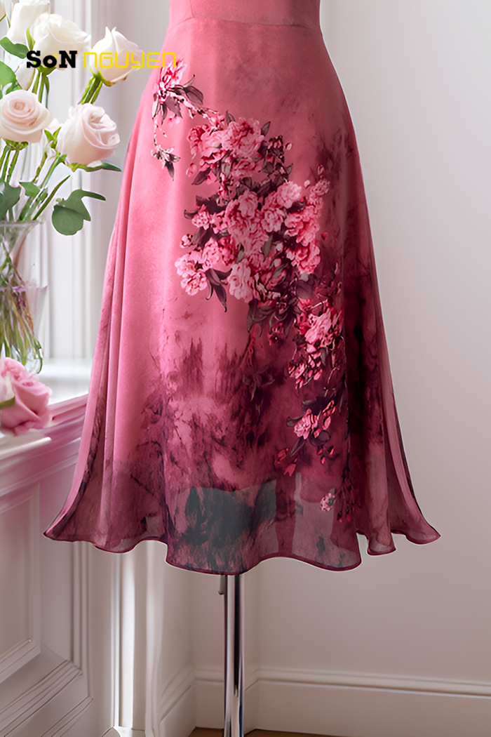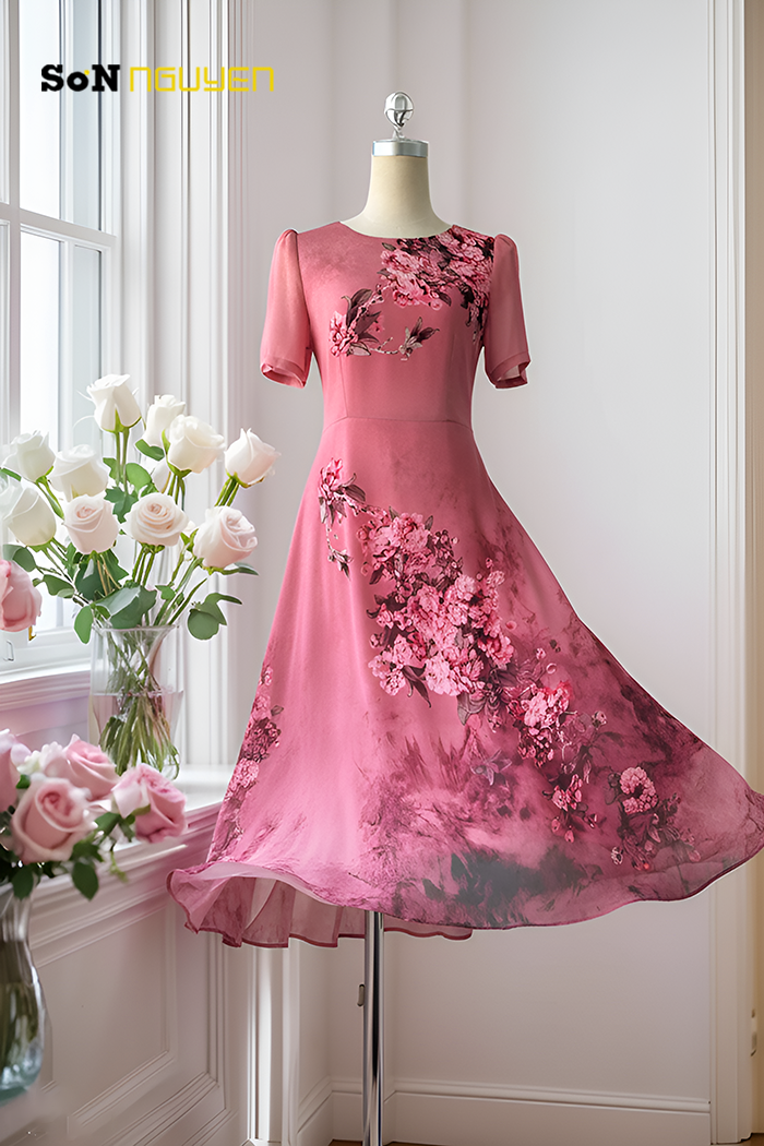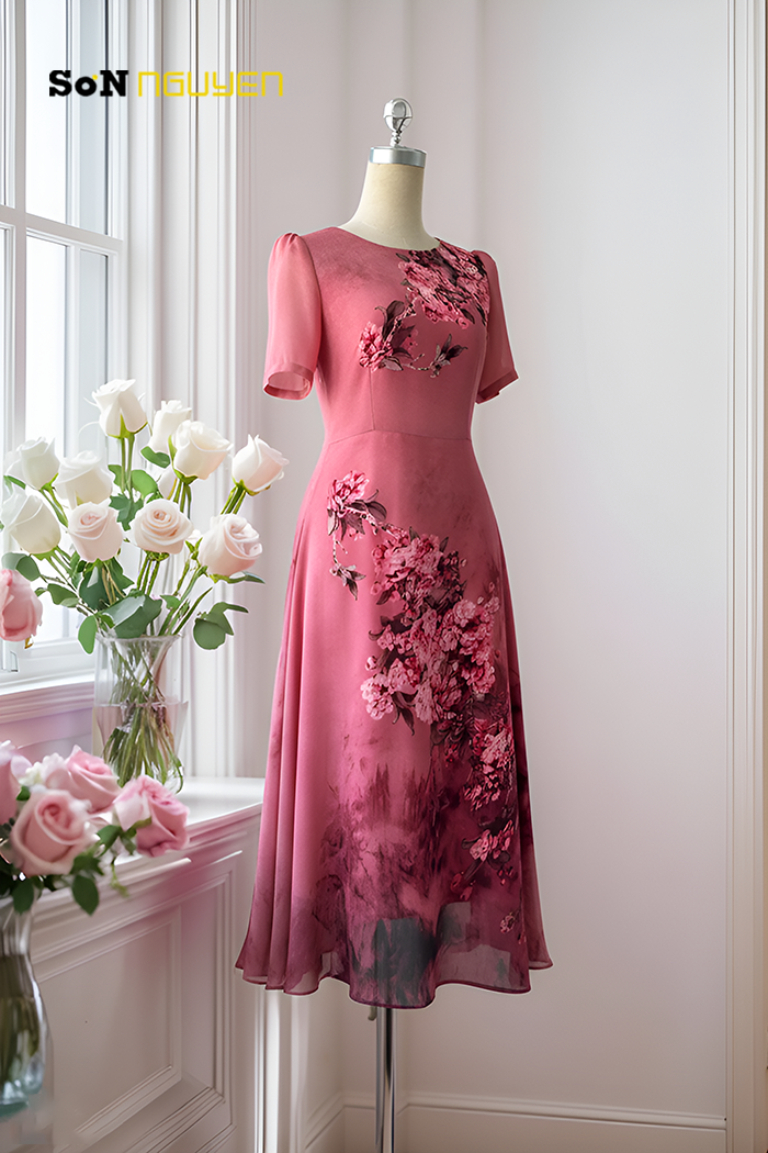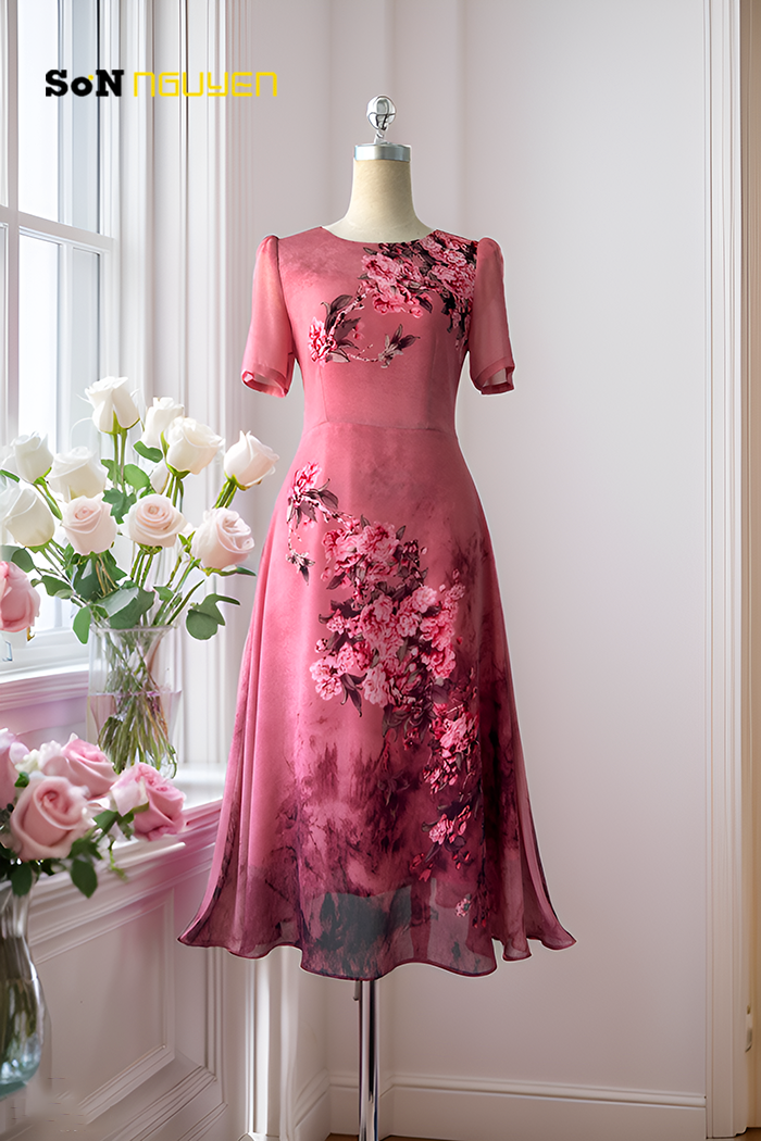 Thiết kế dáng xoè nhẹ tôn vóc dáng, làm nổi bật vòng eo và tạo đường cong quyến rũ cho Quý cô. Với màu hồng dâu trầm, họa tiết hoa lớn được in nổi ở ngực và chân váy tạo điểm nhấn duyên dáng. Chất liệu voan 2 lớp mềm mại, thoáng mát, ít nhăn, đảm bảo độ rũ tự nhiên và sự thoải mái suốt ngày dài. Tay ngắn nhẹ nhàng kết hợp cổ tròn thanh lịch, phù hợp cho các dịp họp mặt hay tiệc nhẹ. Đây là lựa chọn lý tưởng cho phái đẹp trung niên muốn thể hiện gu thẩm mỹ tinh tế và sự nữ tính dịu dàng.